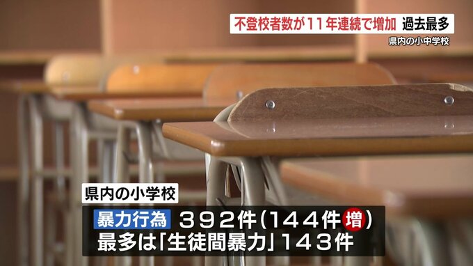 また、県内の小学校では暴力行為も392件と、前の年度より144件増加しました。そのうち最も多かったのは「生徒間暴力」で、143件でした。