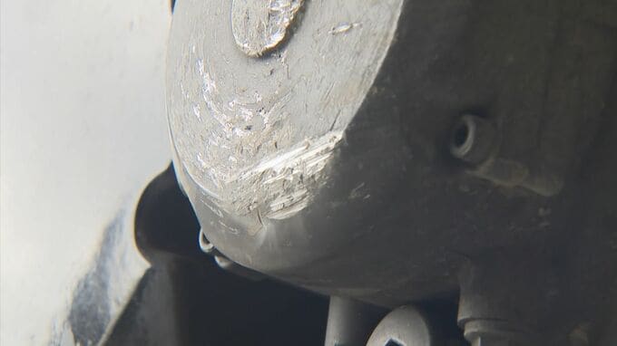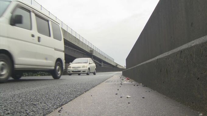 現場は通称・北バイパスから飛田バイパスに降りる途中の直線道路で、道路脇のコンクリート塀には衝突した際にできたとみられる跡が残っていました。