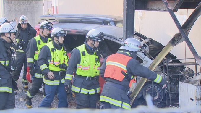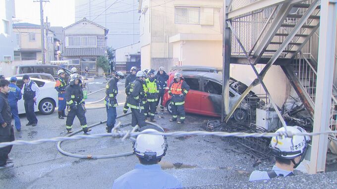 火は約40分後に消し止められましたが、駐車場に停まっていた乗用車1台が全焼しました。けがをした人はいませんでした。
