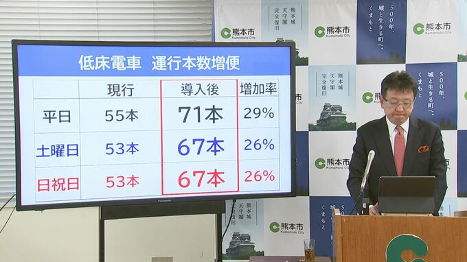 熊本市電で新たに導入される3両編成の新型車両について、熊本市の大西市長は、11月24日に運行を始めると発表しました。