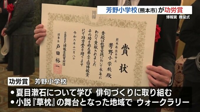 「ことばの力」を育む活動などを顕彰 「博報賞」に 芳野小学校(熊本市) 地域ゆかりの漱石を学ぶ 2024年11月9日(土) 14:59 国内 子どもたちの「ことばの力」を育む活動などを顕彰する「博報賞(はくほうしょう)」に熊本市の芳野(よしの)小学校が選ばれ 8日、東京で贈呈式が行われました。この賞は「公益財団法人 博報堂教育財団」が 児童教…