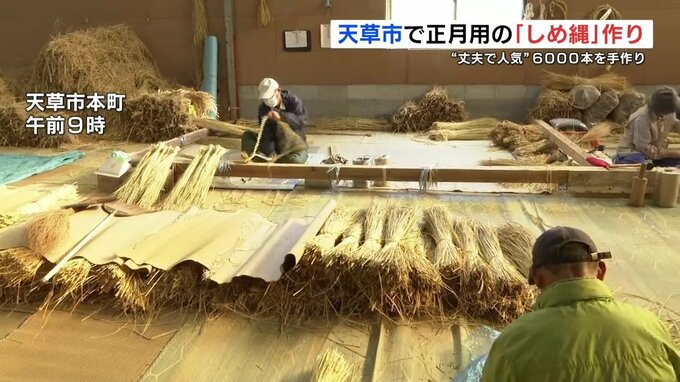 稲わらの香りが立ち込める天草市の作業場では、地元の人たちが「しめ縄」作りに取り掛かっています。