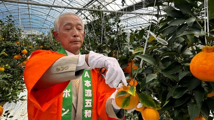 きょう(12日)、天草市五和町で開かれた収穫祭には、JAの関係者や生産者などが出席。収穫の安全を祈願する神事の後、関係者たちが直径9センチ前後のデコポンにはさみを入れました。