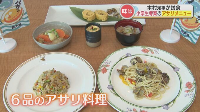 試食役の熊本県の木村敬知事と、県漁連の藤森隆美会長の前に並んだのは、だし巻きやパスタなどアサリを使った6品の料理。これらは県内の小学5年生と6年生、20人が考案しました。