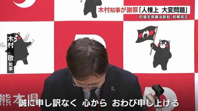 「人権上 大変問題があった」熊本県の木村敬知事が旧優生保護法めぐる裁判和解をうけ謝罪 2024年11月15日(金) 12:15 国内 木村知事は旧優生保護法をめぐる裁判で、国と熊本県内の男女2人との間で和解が成立したことを踏まえて謝罪しました。熊本県 木村敬知事「優生思想に基づく不妊手術の強制などは人権上大変問題があり、県もそうし…