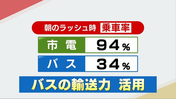 (スタジオ解説)今、朝のラッシュ時の乗車率が市電94%・バス34%です。まだ余裕があるバスの輸送力を活用しようという計画です。
