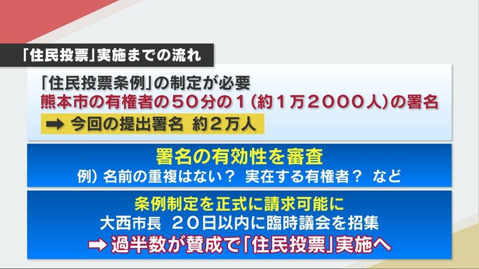 住民投票を実施するには条例の制定が必要になります。そのためには熊本市の有権者の50分の1、約1万2000人の署名が必要で、今回提出された署名数はその数を上回っています。