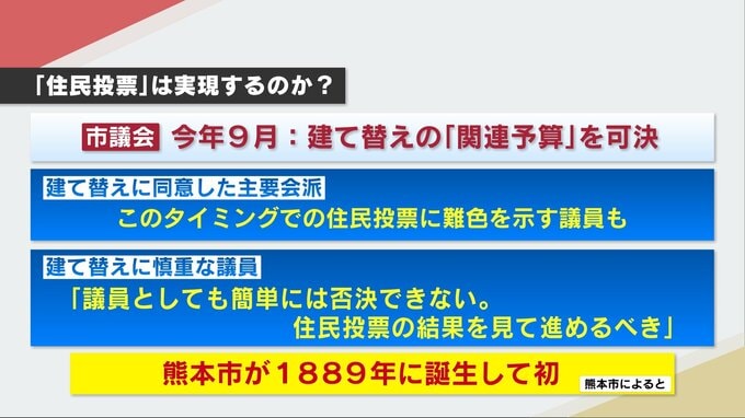 議会は、今年9月に建て替えの関連予算をすでに可決しています。RKKの取材では、建て替えに同意している主要会派の中には、このタイミングでの住民投票に難色を示す議員もいます。