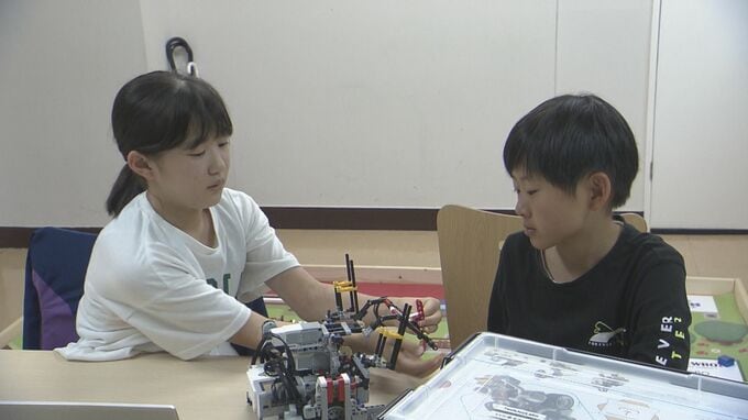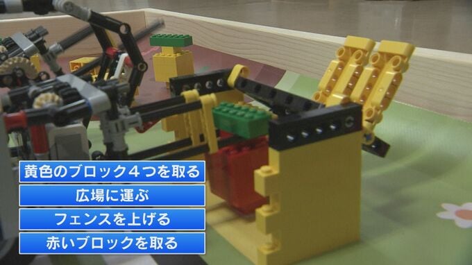 「黄色のブロック4つを取る。そして、広場に運ぶ。フェンスを上げて赤いブロックを取る」など、ロボットを動かすための細かいプログラムを組んだのは、小学6年生の原杏月(はら あずき)さん(12)と小学5年生の西村一真(にしむら かずま)さん(11)です。