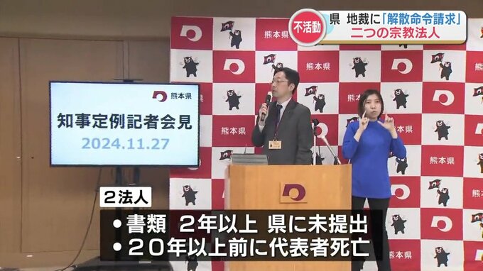 「宗教法人としての活動がない」として、熊本県が二つの法人について裁判所に解散命令を請求しました。