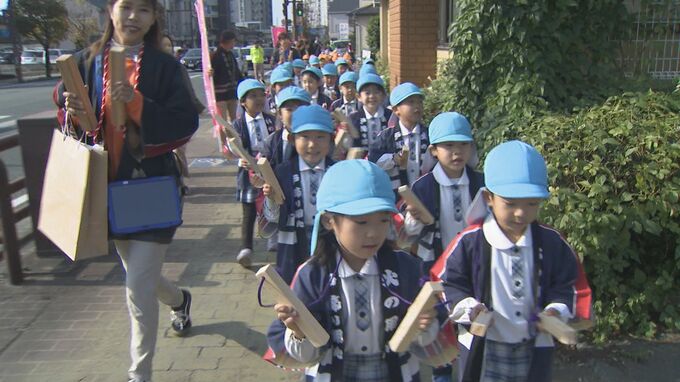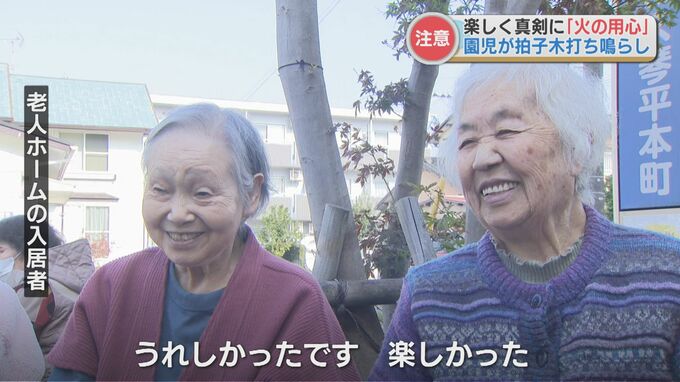 拍子木を打ち鳴らしながら火の用心を呼びかけたのは、熊本市のときわ幼稚園の園児たち。みんなで楽しく住宅地を練り歩きました。