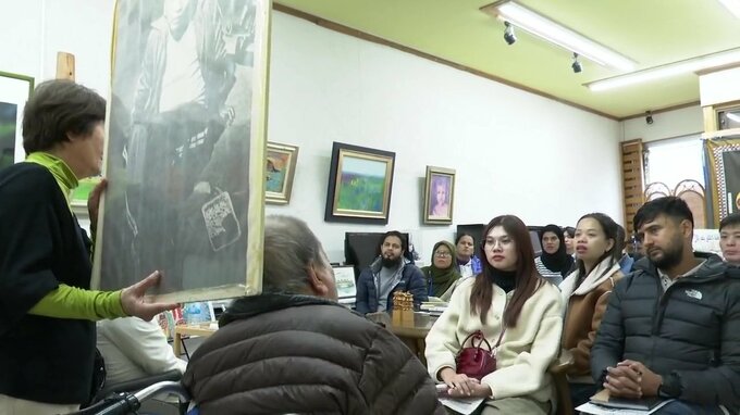 12月5日は、胎児性患者たちのために作業所運営をしている「きぼう・未来・水俣」を訪問。代表の加藤(かとう)タケ子さんから胎児性患者の現状などについて説明を受けていました。