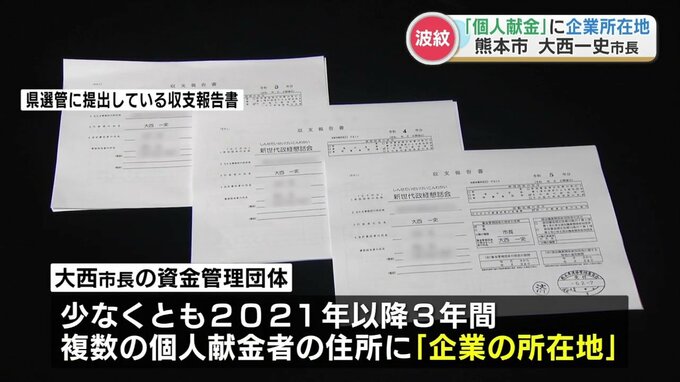 「政治資金規正法に違反か」大西市長の資金管理団体が受け取った『個人献金』に“企業所在地” 熊本 2024年12月10日(火) 19:46 国内 熊本市の大西一史(おおにし かずふみ)市長の資金管理団体が受け取った個人献金について、寄付者の住所に「企業の所在地」が記されていたことが明らかになりました。専門家は政治資金規正法に違反する可能性を指…