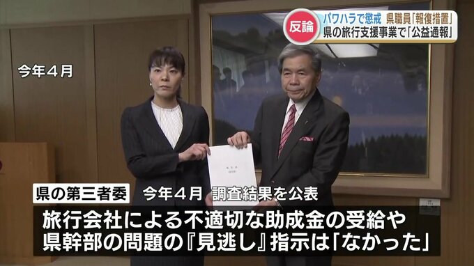 通報者の代理人弁護士は、通報者が県の職員であることを明かした上で、第三者委員会が調査結果を公表した翌日に、通報者が部下へのパワハラを理由に、減給3か月の懲戒処分を受けたことを明らかにしました。