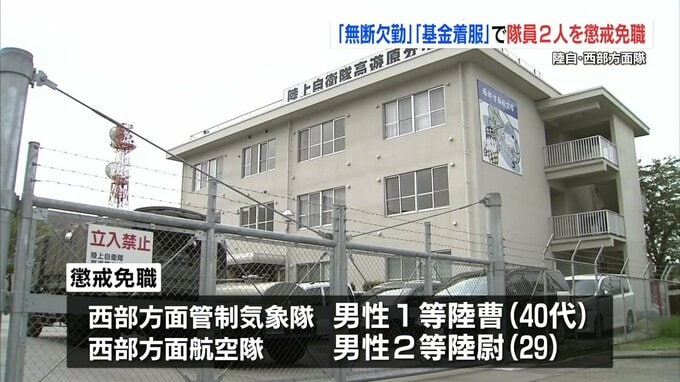 『無断欠勤』『基金着服』で陸自西部方面隊の隊員2人を懲戒免職処分 【熊本】 2024年12月14日(土) 11:07 国内 陸上自衛隊は、西部方面隊に所属する隊員2人を懲戒免職処分にしたと発表しました。懲戒免職されたのは、西部方面管制気象隊に所属する40代の男性1等陸曹と、西部方面航空隊に所属する29歳の男性2等陸尉の2人です。…