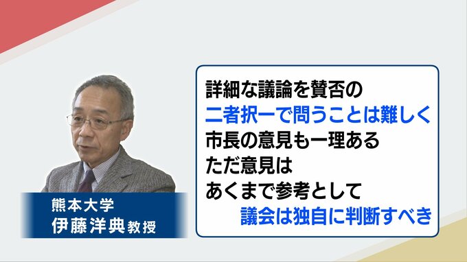 一方で政治学が専門の熊本大学・伊藤洋典教授は「詳細な議論を賛否の二者択一で問うことは難しく、市長の意見も一理ある。ただ意見はあくまで参考として、議会は独自に判断すべき」としています。
