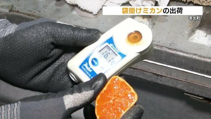 JAれいほくの選果場では、生産者が持ち込んだ袋掛けミカンを職員が糖度計で測定した後、実際に口に含んで味を確かめていました。