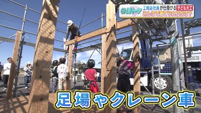 ノコギリや金づちが入った腰袋を下げ、子どもたちが自分たちで家を作るという「大工体験」。足場が組まれ、クレーン車も登場!本格的な作業には職人の大人たちもお手伝いします。