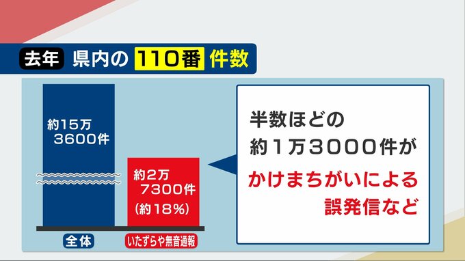 去年(2024年)の通報全体(約15万3600件)のうち約18%がいたずら電話や無音による通報で(約2万7300件)、さらにその半数の約1万3000件がかけまちがいによる誤発信などでした。