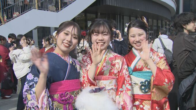 熊本市中央区の花畑広場にはスーツや振袖姿の若者たちが集まっていました。