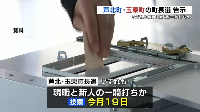 芦北町と玉東町の町長選挙告示 いずれも現職・新人の一騎打ちか 投票は19日 熊本 2025年1月14日(火) 12:12 国内 任期満了に伴う、熊本県芦北町と玉東町の町長選挙が1月14日に告示されました。いずれも現職と新人との一騎打ちの公算が大きくなっています。1月14日午前11時までに芦北町長選に立候補しているのは、届け出順に6期…