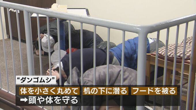 体を小さく丸めて、机の下に潜ったりフードを被ったりして頭や体を守ります。合言葉は『ダンゴムシ』です。