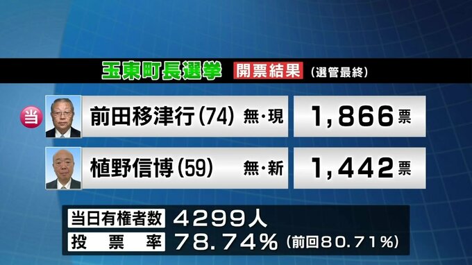 玉東町では、無所属で現職の前田移津行(まえだ いつゆき)さん(74)が、無所属新人で青果卸売会社役員の植野信博(うえの のぶひろ)さん(59)を接戦の末に破り、7回目の当選を果たしました。