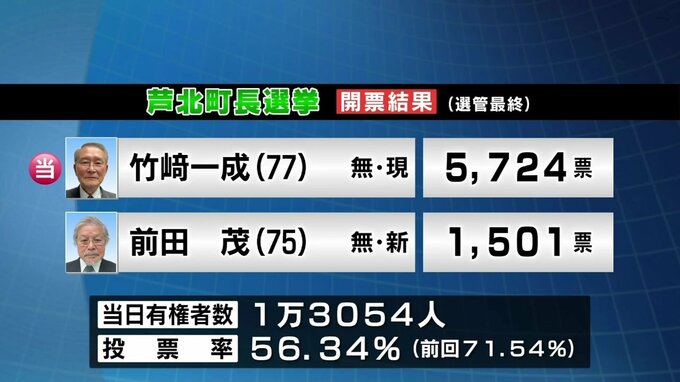 一方、芦北町では、無所属で現職の竹﨑一成(たけざき かずなり)さん(77)が、無所属新人で1級建築士の前田茂(まえだ しげる)さん(75)を大差で破り、6回目の当選を果たしました。