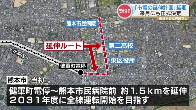 市は当初、市電の健軍町電停から熊本市民病院前までの約1.5キロを延伸し、2031年度に全線での運転開始を目指していましたが、去年(2024年)運行トラブルなどが相次いだことを受け、安全管理を優先するため計画を延期する考えです。