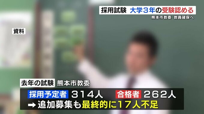 熊本市 教員採用試験を大学3年生から受験可能に 採用予定数届かず「なり手不足」深刻化 2025年1月29日(水) 12:02 国内 教員のなり手不足を解消するため、熊本市教育委員会が新たに大学3年生での教員採用試験の受験を認めることにしました。2024年、熊本市教育委員会が実施した教員採用試験は合格者の数が採用予定の人数に届かず、な…