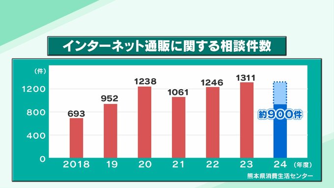熊本県消費生活センターによりますと、県内のインターネット通販に関する相談件数は増加傾向にあり、2018年で693件だったのが、2023年には1311件と2倍近くになっています。また今年度もこれまでに約900件と高止まりです。