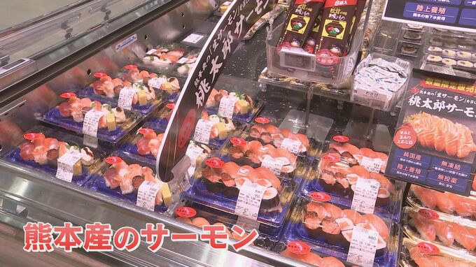 記者「お昼時の売り場にはお寿司がずらっと並んでいます。ひときわ目を引くのが熊本県産のサーモンです」