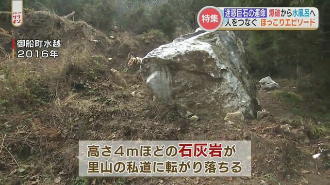 御船町(みふねまち)水越(みずこし)。熊本地震の揺れで高さ4メートルほどの巨大な岩が