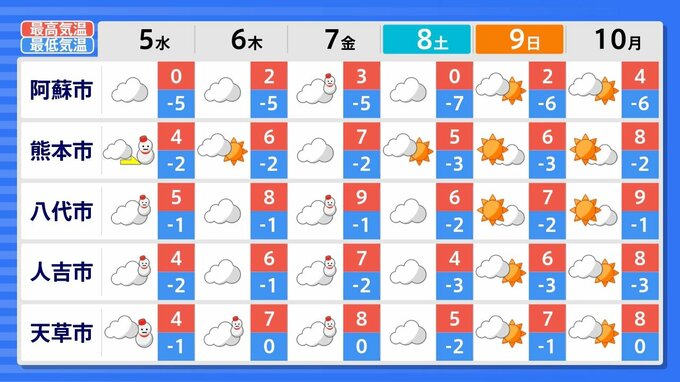 「雪合戦はしたいけど…」熊本県内は“今季一の寒波”で4日(火)~6日(木)まで大雪のおそれ 2025年2月3日(月) 12:16 国内 天気 2月4日(火)の天気予報【熊本】 2月5日(水)~10日(月)の天気予報【熊本】