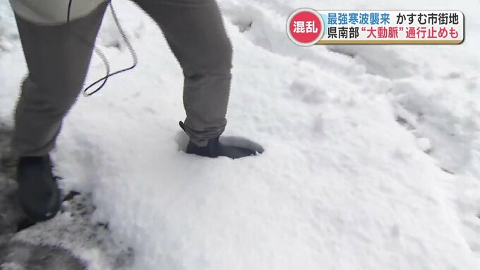 記者「水俣市葛渡です、道路わきの雪に足を入れると足首まで雪が積もっているのがわかります」