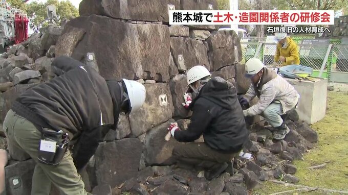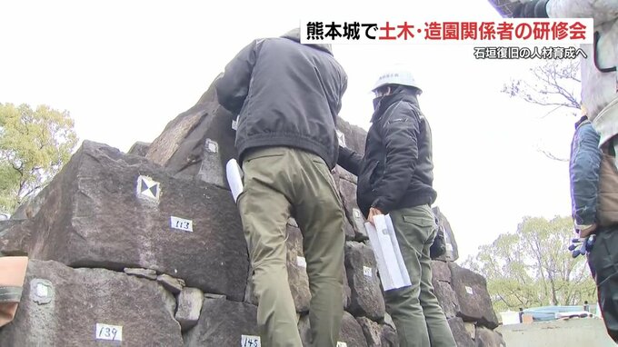 石垣の復旧が進む熊本城ですが、いま、技術者のなり手が不足しています。そこで熊本市の造園建設業協会が、石垣に少しでも関心を持ってもらおうと研修会を開きました。