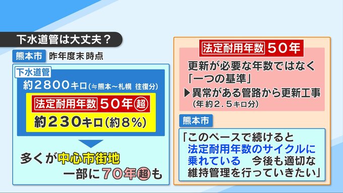 熊本市内には2023年度末時点で、あわせて2800キロほどの下水道管が通っていて、そのうち法定耐用年数の50年を過ぎているのは約230キロ。その多くが中心市街地にあり、一部に70年を越えているものもあるということです。