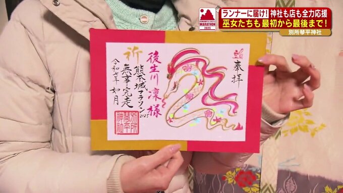 今回は特別に、熊本城マラソンを走る後生川凜(ごしょがわ りん)アナウンサーのためにオリジナル御朱印を描いてもらいました。御朱印を仕上げてもらう間に、熊本城マラソンの完走を祈祷します。