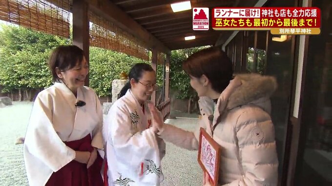 巫女たちは毎年、マラソンの最初から最後まで沿道に立ってハイタッチでランナーにエールを送り続けています。