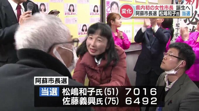 任期満了に伴う阿蘇市長選挙で初当選を果たしたのは、無所属・新人で元合志市職員の松嶋和子(まつしま かずこ)氏(51)。