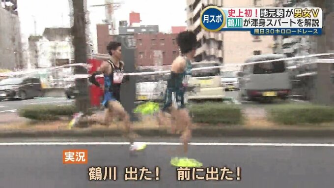 実況「鶴川、出るか?横を見る。横を見る。鶴川、出た!前に出た!鶴川スパート!米満も反応!」