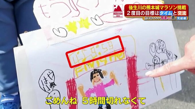 残り2キロほどの場所では、6歳の子が「ごしょがわさん がんばれ」「もうすぐゴール」というメッセージ&イラストで応援してくれました。