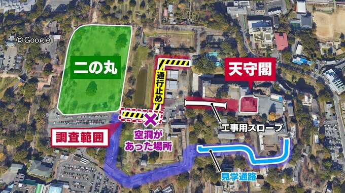 (スタジオ解説)1月に空洞が見つかったのは、二の丸と加藤神社を結ぶ通路で、今回は、この周辺部分、長さ約80メートルにわたって調査を行いました。