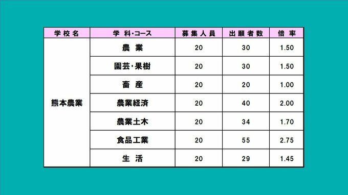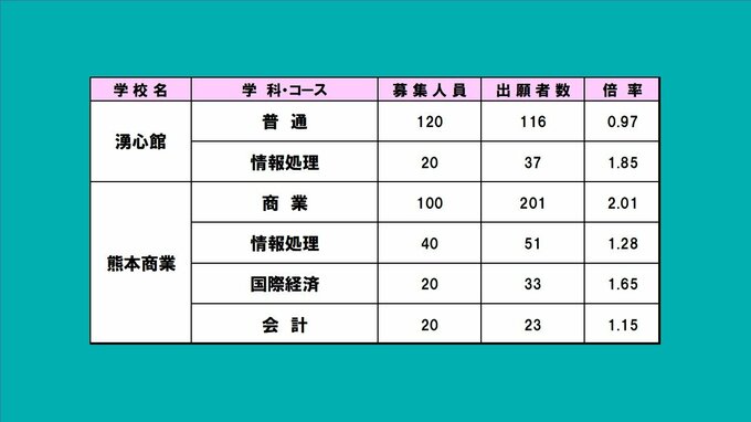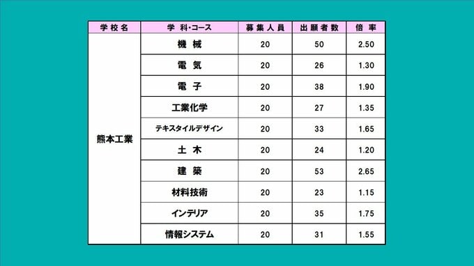 熊本県公立高校入試2025 志願倍率(出願変更後)済々黌、熊本、第一、第二ほか 最高倍率は大津(普通・スポーツ)4.00倍【全日制52校の全学科・コース一覧】 2025年2月21日(金) 15:29 国内 熊本商業(商業)2.01倍・熊本工業(機械)2.50倍など