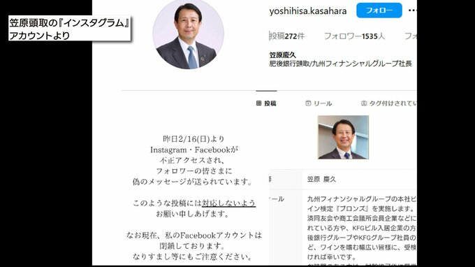 肥後銀行によりますと、乗っ取られたのは、笠原頭取の『インスタグラム』と『フェイスブック』で、2月16日に銀行側が投稿内容を見て乗っ取られたことに気づきました。