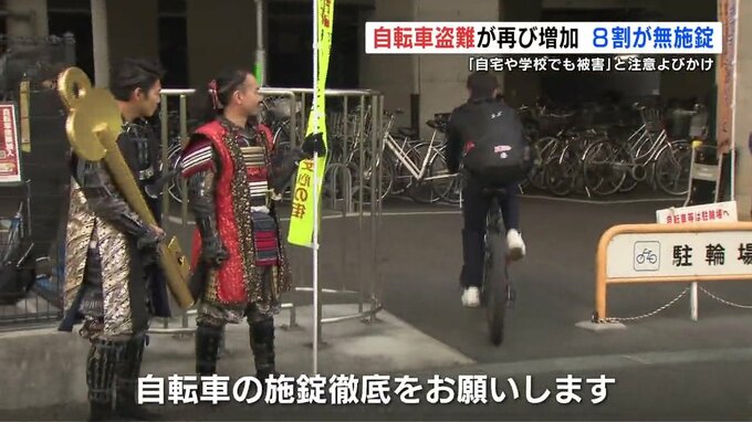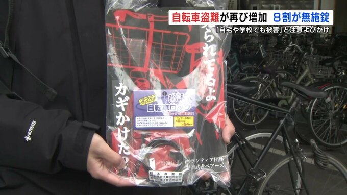 熊本県内で自転車の盗難被害が増加しています。被害を防ごうと、警察官たちが熊本市で自転車のカギかけを呼びかけました。