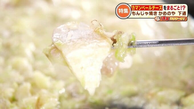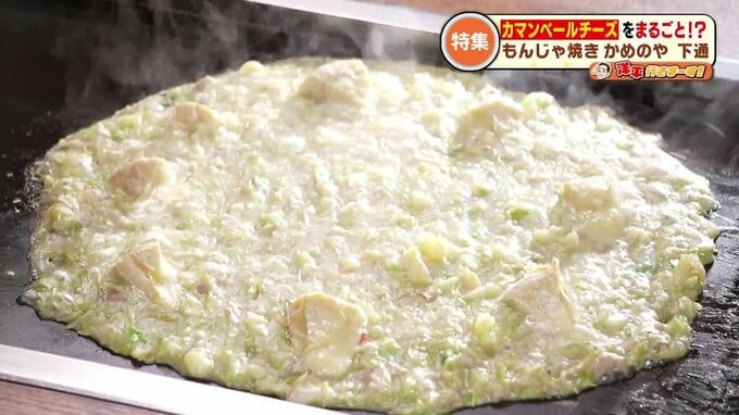 具材はキャベツに豚肉、ジャガイモ、切りイカなどが盛られていて、その上に直径約10cmのカマンベールチーズ。もんじゃに欠かせないだしは、具材の味を損なわない自家製のものを使っています。