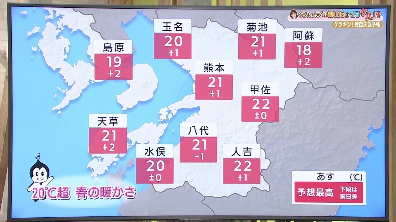 日中の最高気温です。20℃超えのところが出てきそうです。甲佐町で22℃、菊池市で21℃、阿蘇市も18℃まで上がるでしょう。