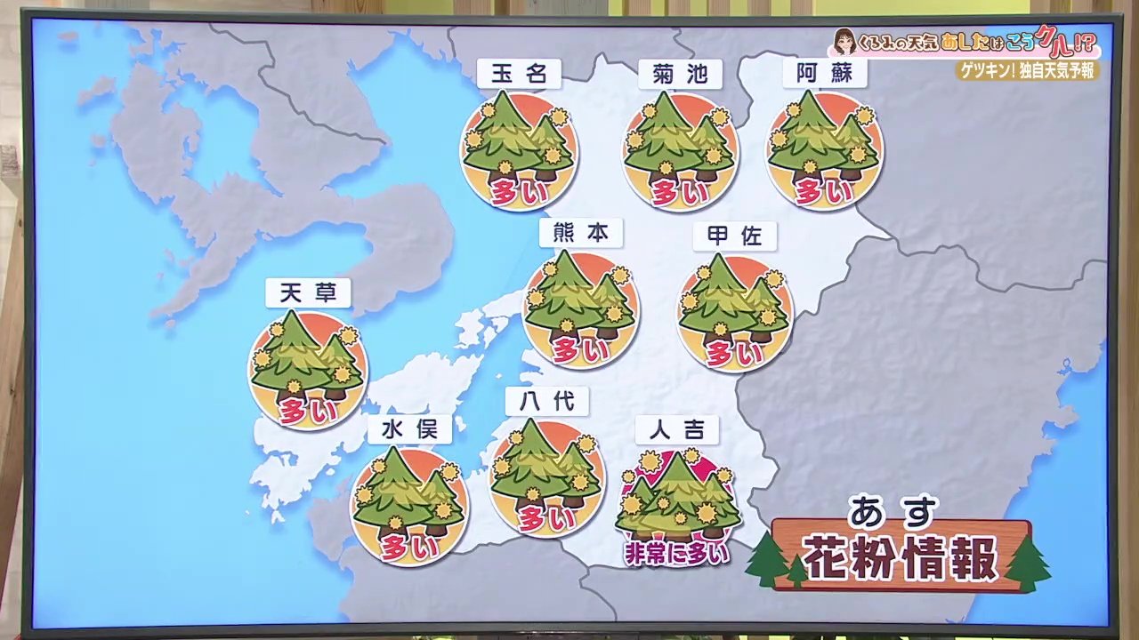 花粉情報です。広く多く飛び、熊本県人吉市は非常に多いでしょう。