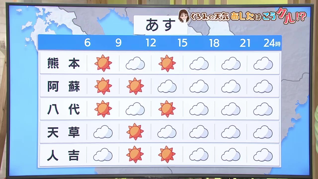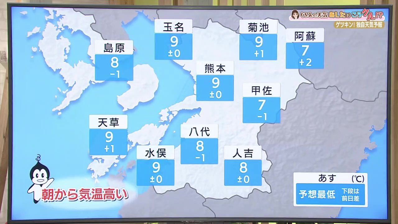 朝の最低気温です。暖気が入っていて朝もあまり気温は下がりません。熊本市や菊池市で9℃、八代市で8℃の予想です。